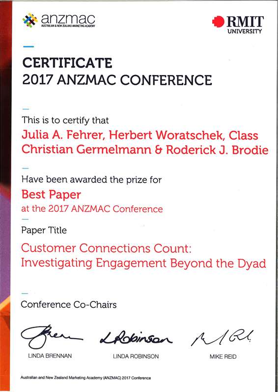 Am 27.03.2019 erhielt Dr. Julia Fehrer den Emergent Scholar Research Award der Uni Auckland Business School bei einer feierlichen Preisverleihung.